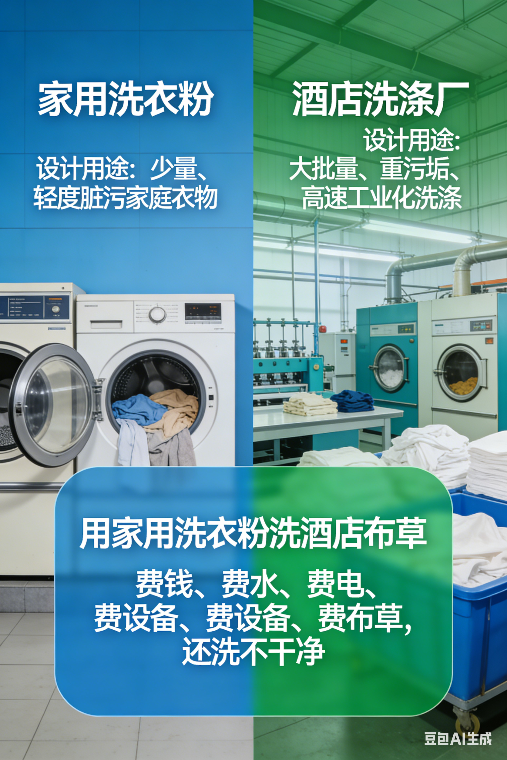 简单说:不是不能用,是用了必亏、还容易出大问题。酒店布草洗涤厂用家用洗衣粉,完全不符合工业洗涤逻辑,成本、效果、设备、卫生全都扛不住。