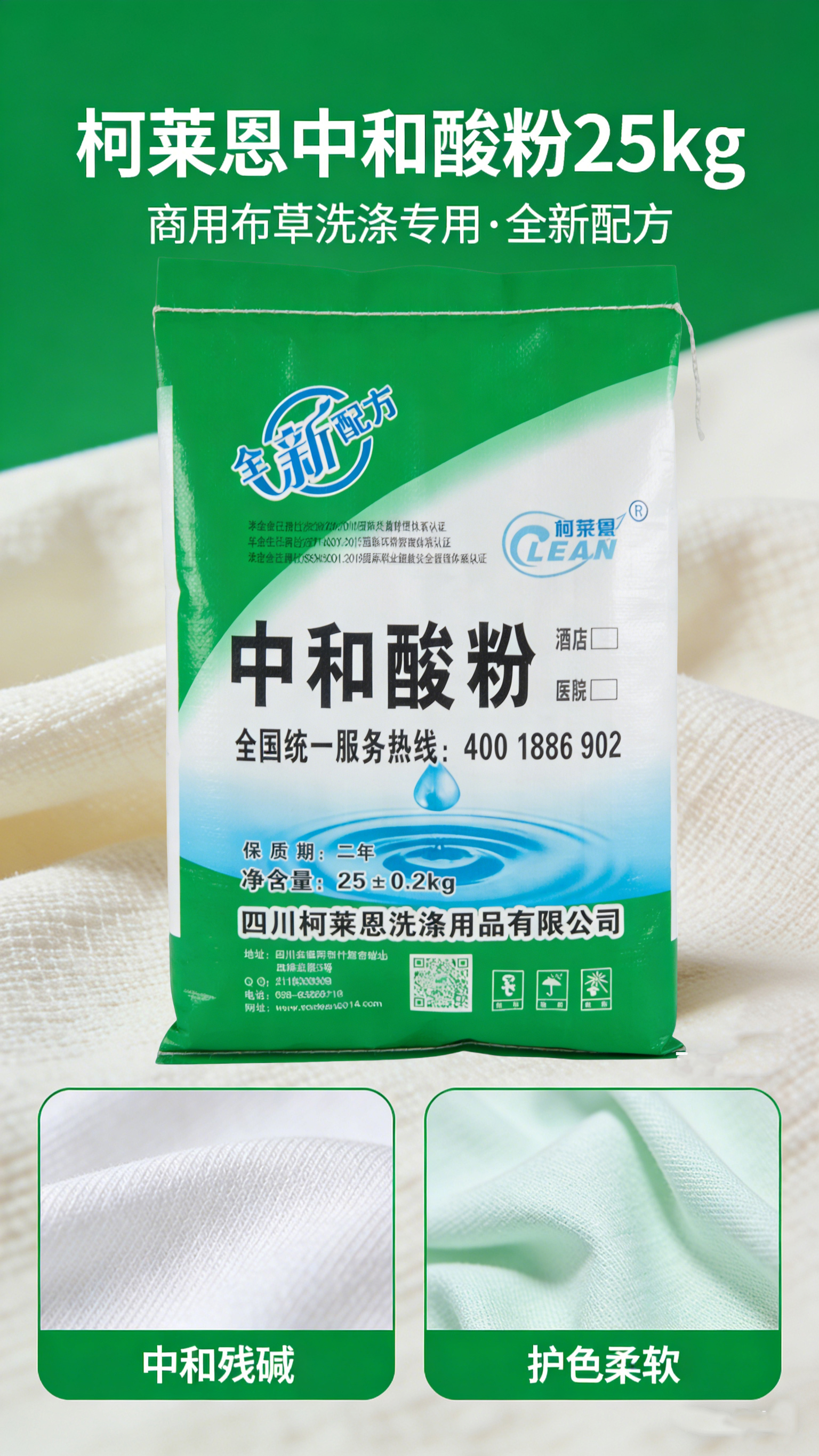 4. 高效便捷 粉末状易溶解,可直接加入漂洗阶段,操作简单,适配各类商用洗涤设备,不影响洗涤效率。